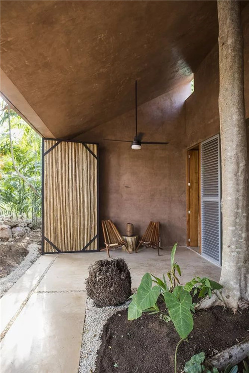 在材質方面,建筑涂層明顯減少了維護。這些地板是混凝土路面(帶有生態(tài)圈接縫以釋放土壤水分),以及用于裝配固定家具的現場預鑄板。墻壁和天花板上有一個用現場土的色調著色的燃燒的灰泥。木工用的是耐白蟻的硬木。這種餐具是用天然鋁和溫帶玻璃制成的。所有室內空間都考慮蚊帳。